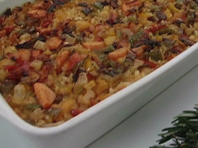 Горячее блюдо из овощей и риса.Состав:рис — 1,5 стакана;овощной бульон — 3 стакана;балгарский перец — по 1/4 стакана;лук — 1/4 стакана;морковь — 1/4 стакана;чеснок — 1 зубчик;паприка, оливковое масло — по вкусу.
