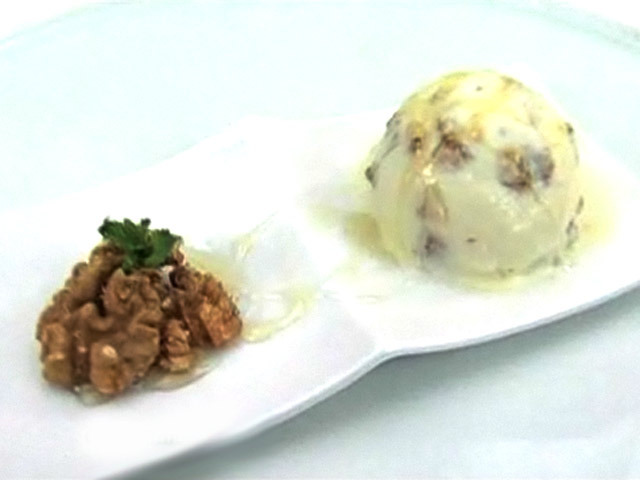 Рецепт десерта из мороженого.Состав:мед — 130 гр;сливки — 320 гр;молоко — 210 гр;сухое молоко — 30 гр;грецкие орехи.