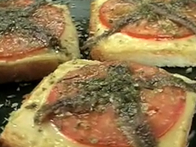 Рецепт простой пиццы.Состав:помидоры, сыр, масло, хлеб, орегано, соль, анчоусы.