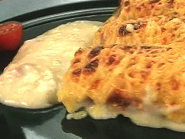 Легкая закуска из салата с ветчиной.Состав:эндивий — 2 качана;ветчина — 7 кусочков;молоко, мука, соль, сыр, масло.