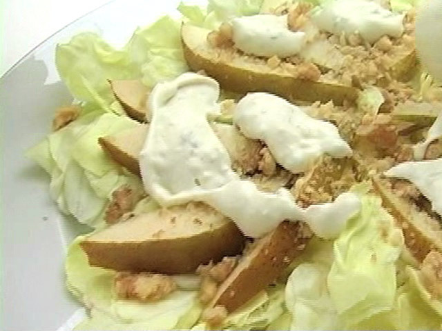 Вкусный салат из груши с сыром.Состав:салат-латук — 1 качан;грецкие орехи — 30 гр;груши — 2 штуки;лимонный сок — 2 столовые ложки;сливки — 8 столовых ложек;сыр горгонзола — 30 гр;белый перец.